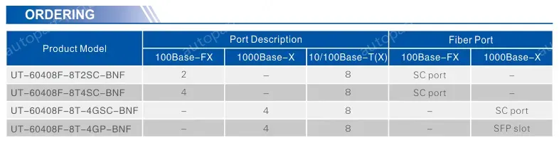 UT-60408F series are unmanaged industrial Ethernet switches. It supports up to 12 ports, which included 4 Gigabit fiber ports(SC/ST/FC/SFP slot); this enhances the networking flexibility. This switch is low power consumption; the fanless design prevent it from noise interference; at the same time, the operating temperature range is from -40~85℃; and the switch is with good EMC compatibility. These make the switch provides safe and reliable solution for industrial automation, intelligent transportation, video monitoring, and other industrial application networking access.