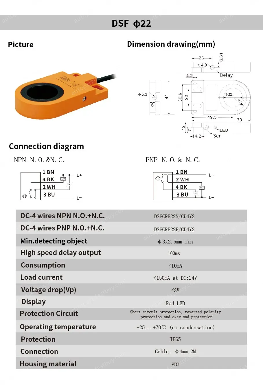 • Ring Inductive Proximity Sensordetection distance: 22mmPNP,N.O.+N.C.DC12-24V